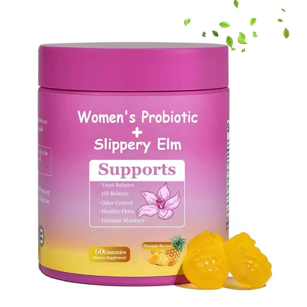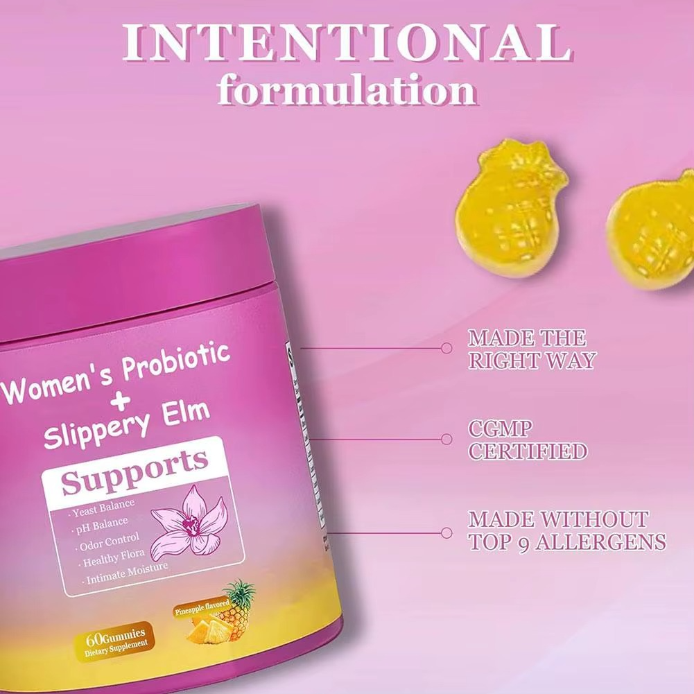 Support your feminine health naturally with these delicious pineapple-flavored probiotics gummies. Formulated with a blend of Lactobacillus strains, slippery elm, and prebiotics, they help maintain pH balance, promote gut health, and strengthen your immune system. Convenient and tasty, these gummies make daily wellness easy and enjoyable. With 60 gummies per bottle, you have a reliable way to nurture your body from the inside out.